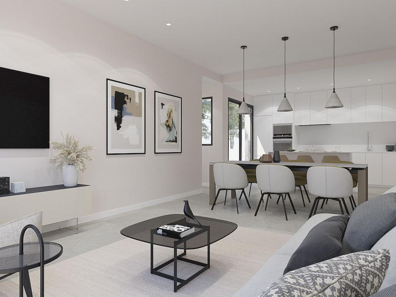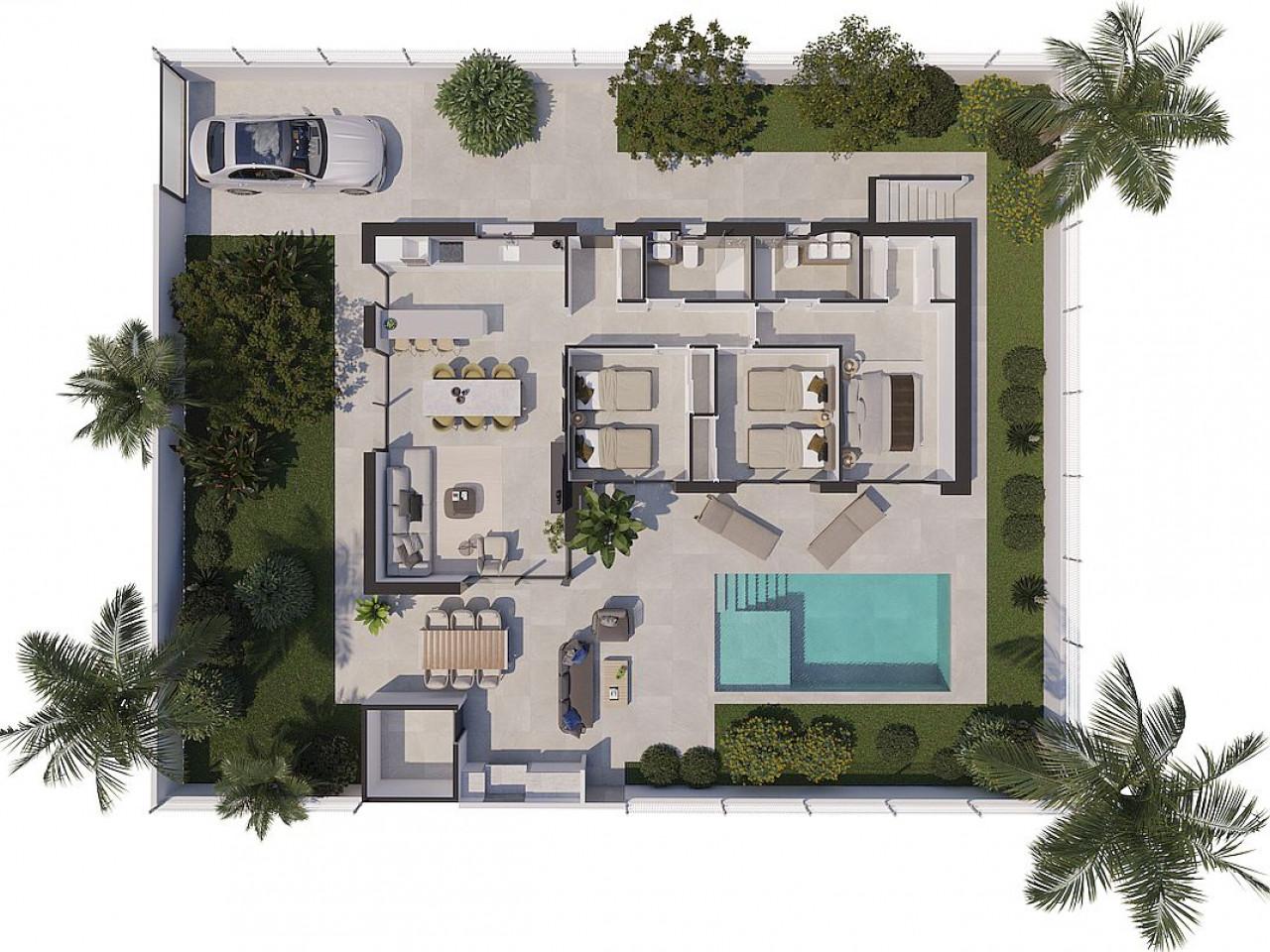 Das architektonische Design und die breite Verteilung auf einer Etage, ermöglicht allen Zimmern einen direkten Zugang zum privaten Pool und Grillplatz durch große Fenster. Darüber hinaus wird Sie die spektakuläre 100m2 große Sonnenterrasse mit direktem Zugang vom Garten aus mit ihren Sonnenuntergängen und dem Blick auf das Mittelmeer verzaubern.