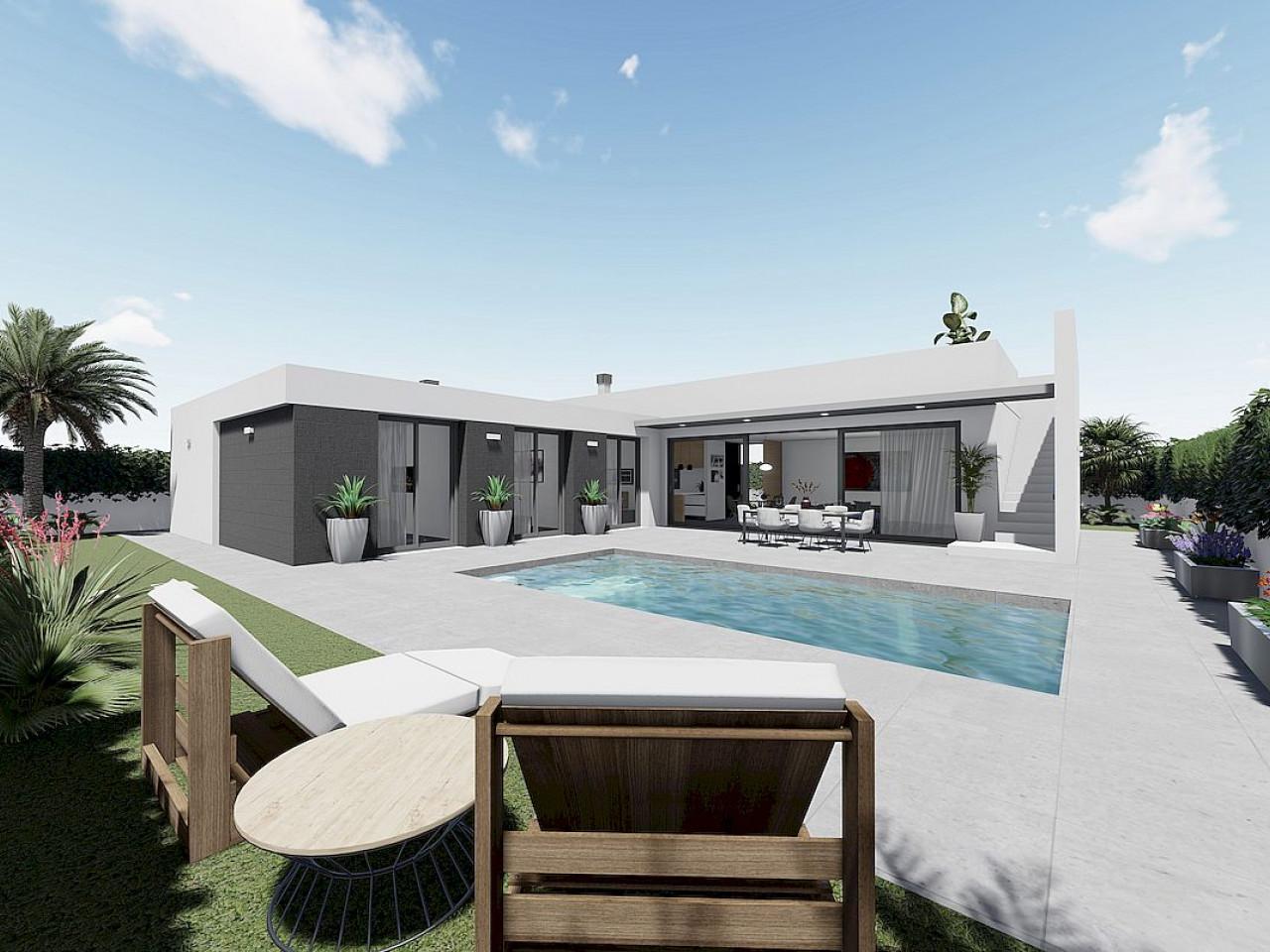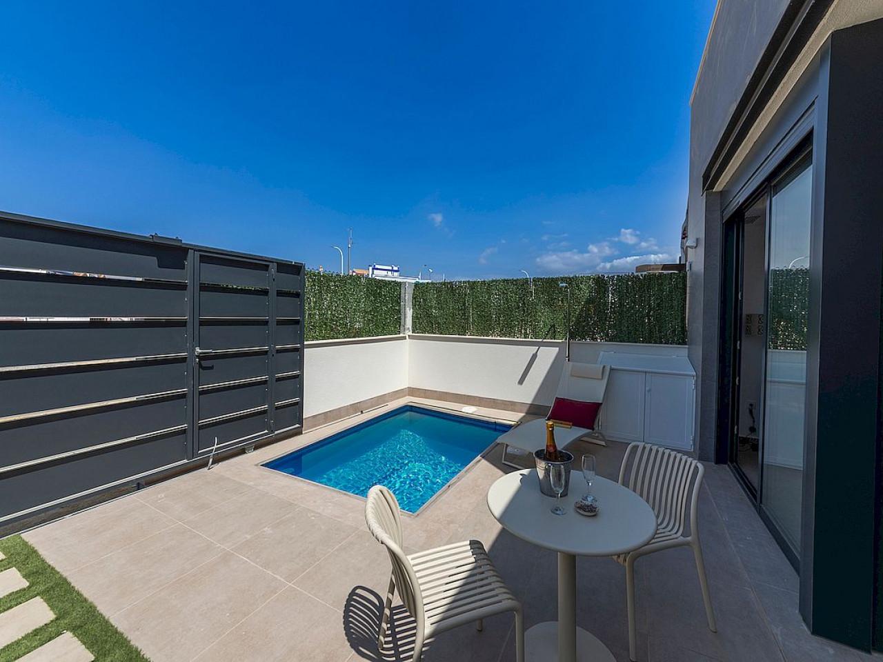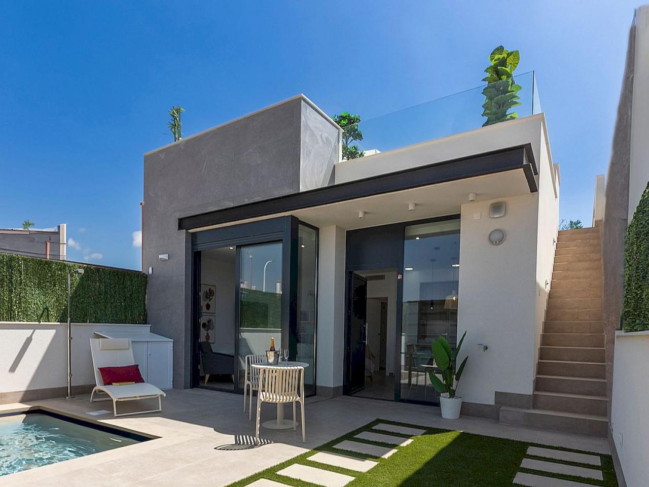 Wunderschöne einstöckige Villen mit 2 oder 3 Schlafzimmern und 2 Bädern, freistehend oder als Doppelhaushälfte, mit Solarium und privatem Pool, nur 400 Meter von den Stränden entfernt.