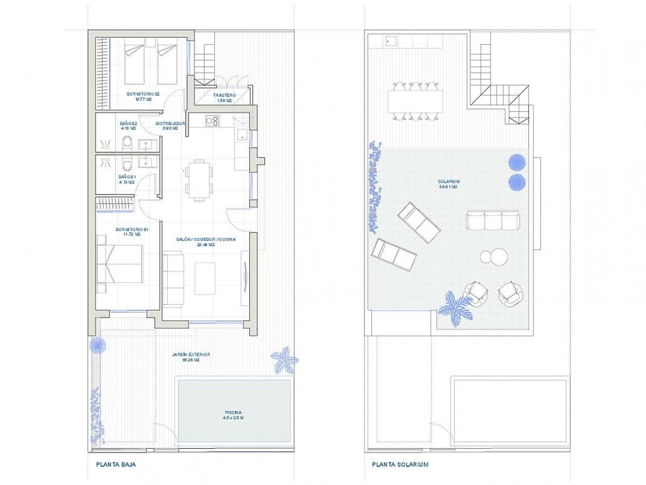 Diese Villen mit 2 oder 3 Schlafzimmern und 2 Bädern, Garten, Parkplatz, Solarium und privatem Pool werden Grundstücksgrößen zwischen 140 m2 und 159 m2 haben. Die Villen werden zwischen 74,72 m2 und 85 m2 groß sein und die Pools werden eine ungefähre Größe von 4,5 m x 2,5 m haben.