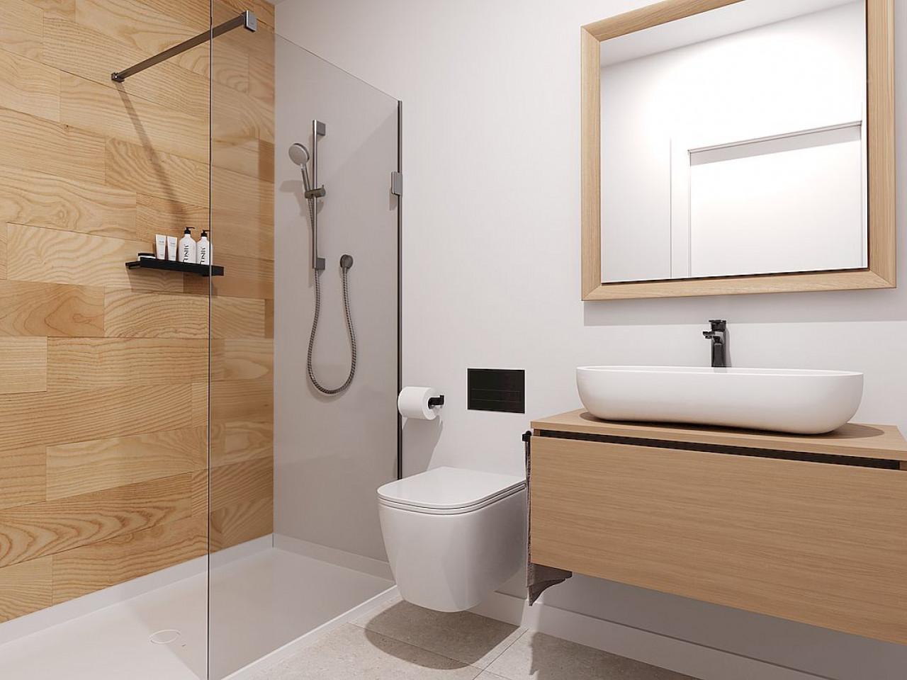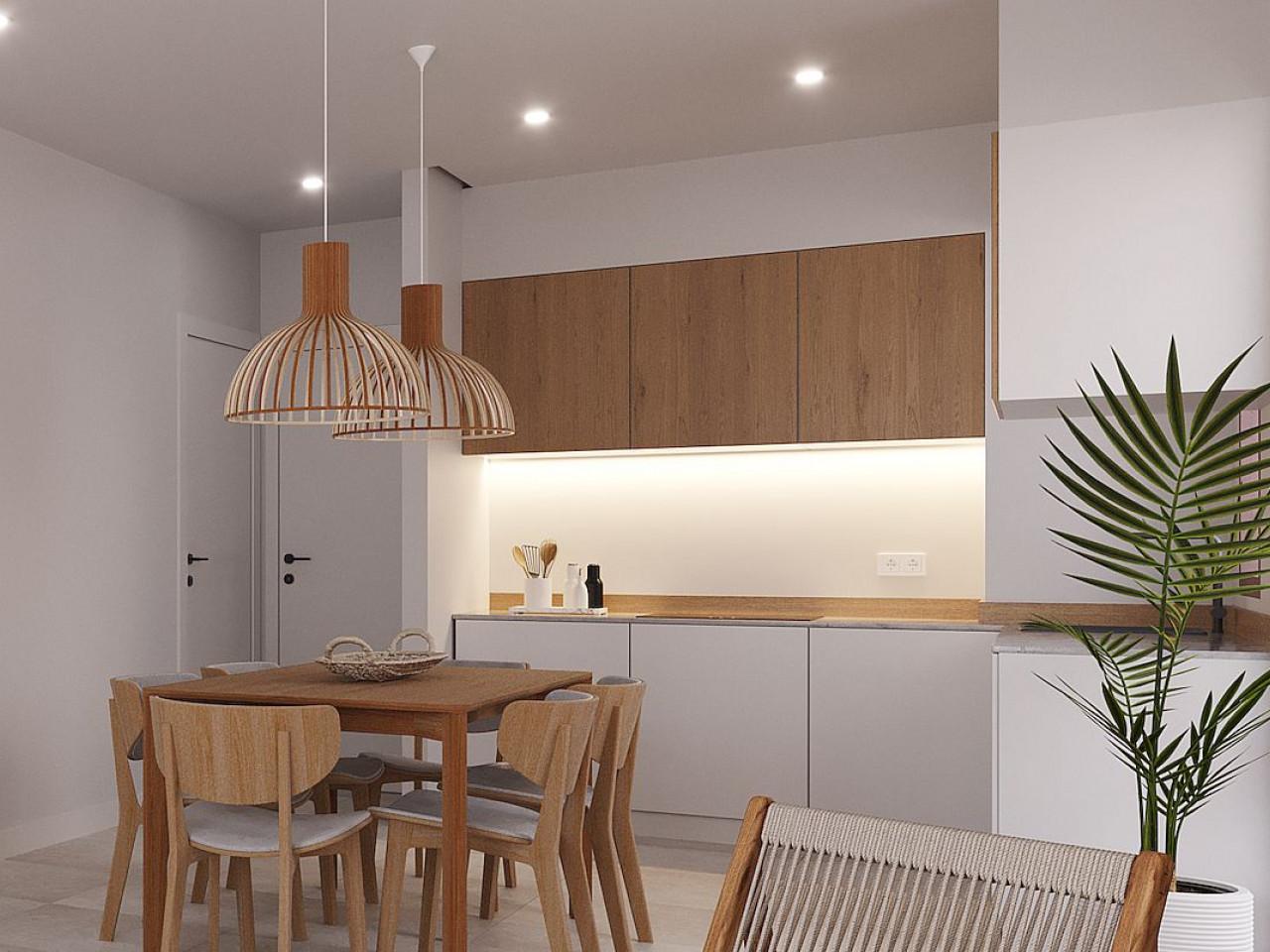 Die Küchen werden voll ausgestattet sein, in weißer Farbe mit Holzimitat kombiniert, wie aus den Plänen hervorgeht. Sie umfassen einen Kühlschrank, einen Backofen, einen integrierten Geschirrspüler, ein Cerankochfeld und eine Dunstabzugshaube. Die Bäder werden komplett mit Badmöbeln, Spiegel, Beleuchtung und Duschabtrennung geliefert.