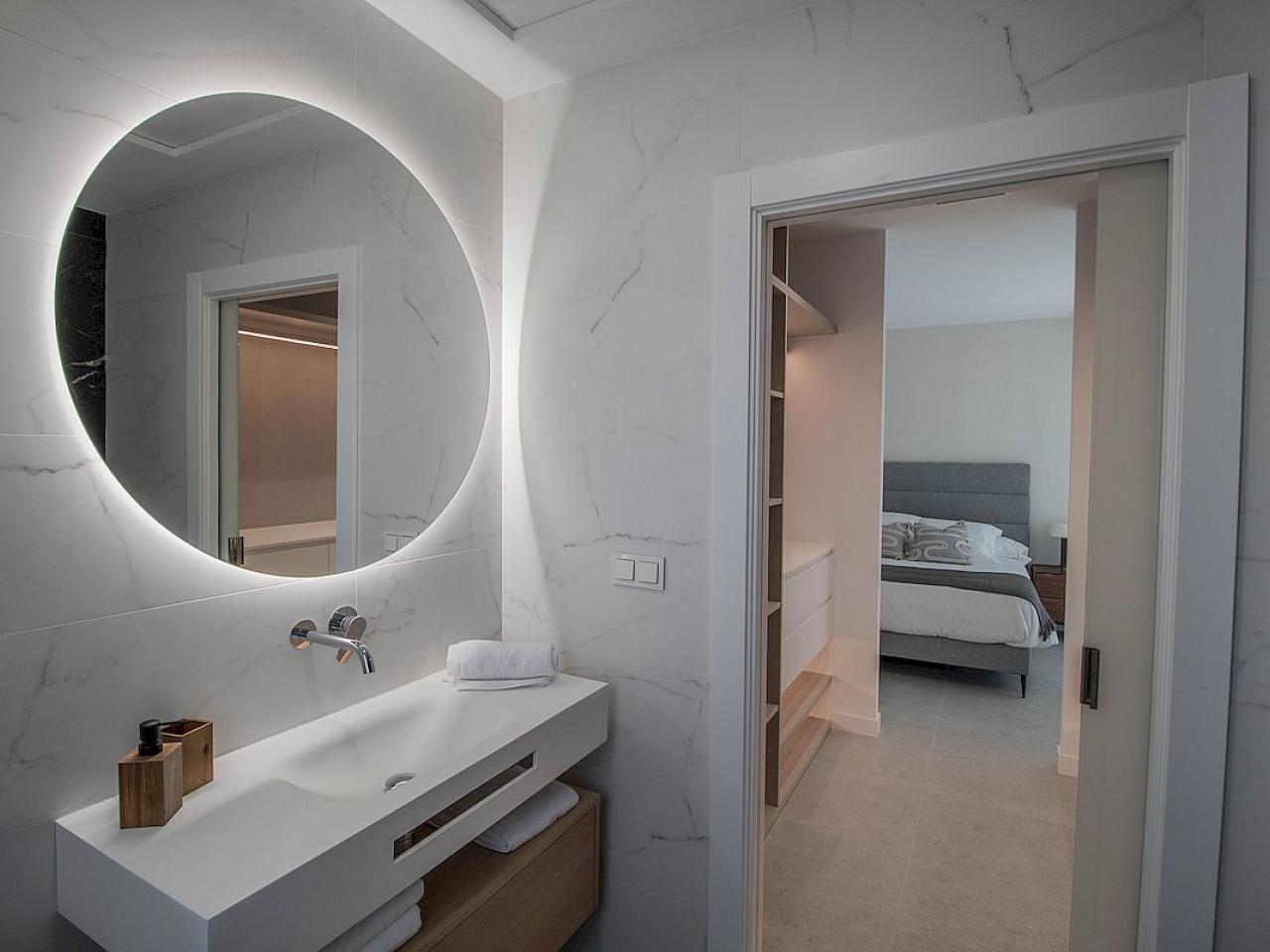 Im Erdgeschoss sind die Wohnbereiche nach außen hin offen und lassen das Licht und das mediterrane Wetter auf sich wirken. Es gibt ein Schlafzimmer und ein komplettes Badezimmer, die Küche und das Wohnzimmer erstrecken sich bis zur Vorderseite des Hauses, wo der Pool und die Terrasse das Mittelmeer ins Haus bringen. Die hohen Decken lassen viel Sonnenlicht herein und die großen Fenster lassen den Außenbereich mit dem Innenbereich in einer Harmonie von Farben und Texturen verschmelzen.