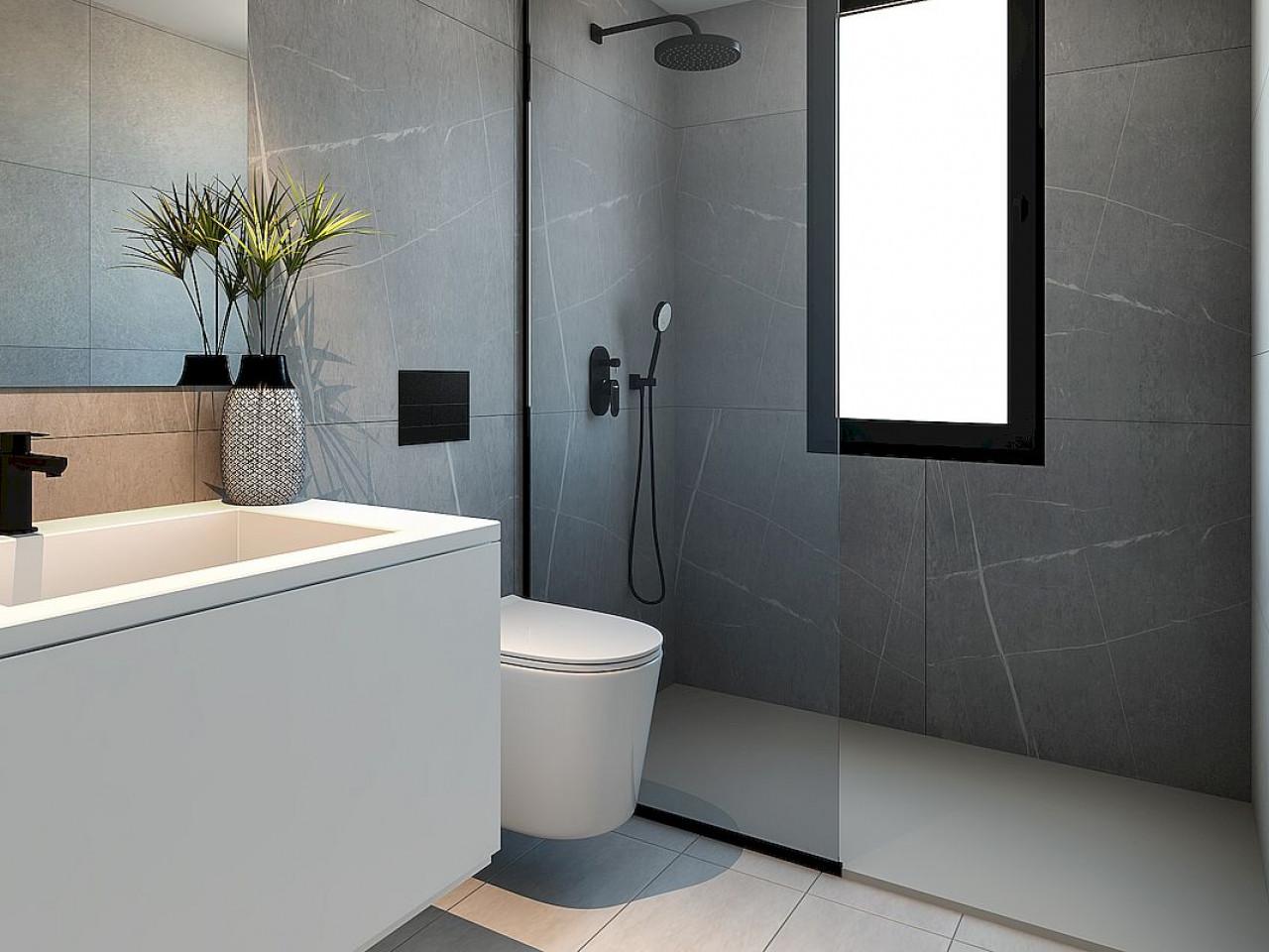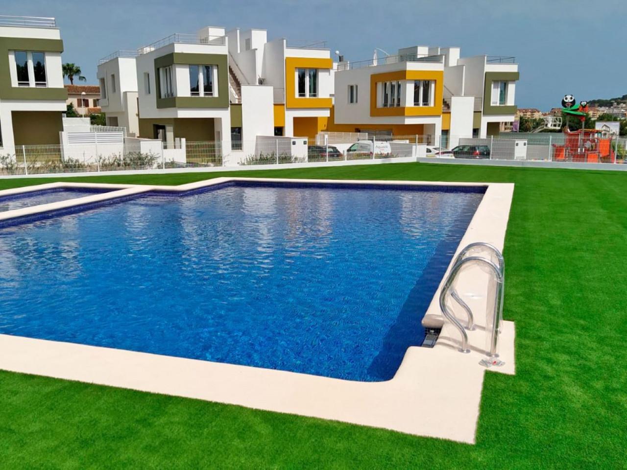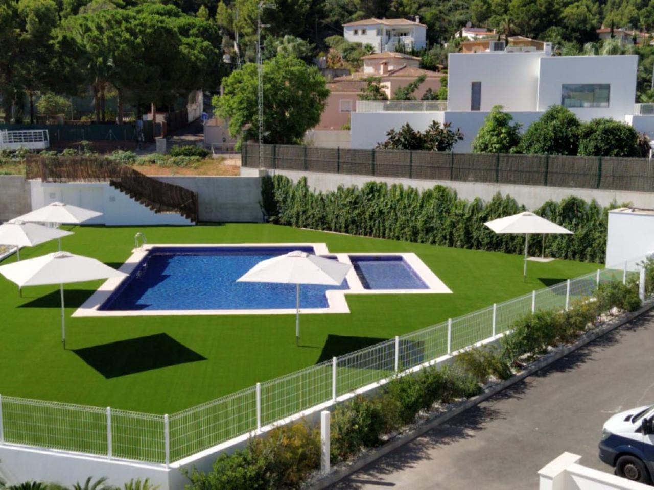Außerhalb, Parkplatz für 2 Fahrzeuge und gemeinsame Bereiche mit Kinderspielen und einem großen Swimmingpool für Kinder und Erwachsene mit seinen Gartenbereichen. Dank des mediterranen Klimas, das diese Gegend charakterisiert, werden die Außenbereiche des Hauses mehr denn je genossen: ein Garten im Erdgeschoss mit einem Esstisch und ein weiterer Chill-out-Bereich mit niedrigen Sesseln, der durch eine große Glasschiebetür mit dem Wohn-Esszimmer verbunden ist.
