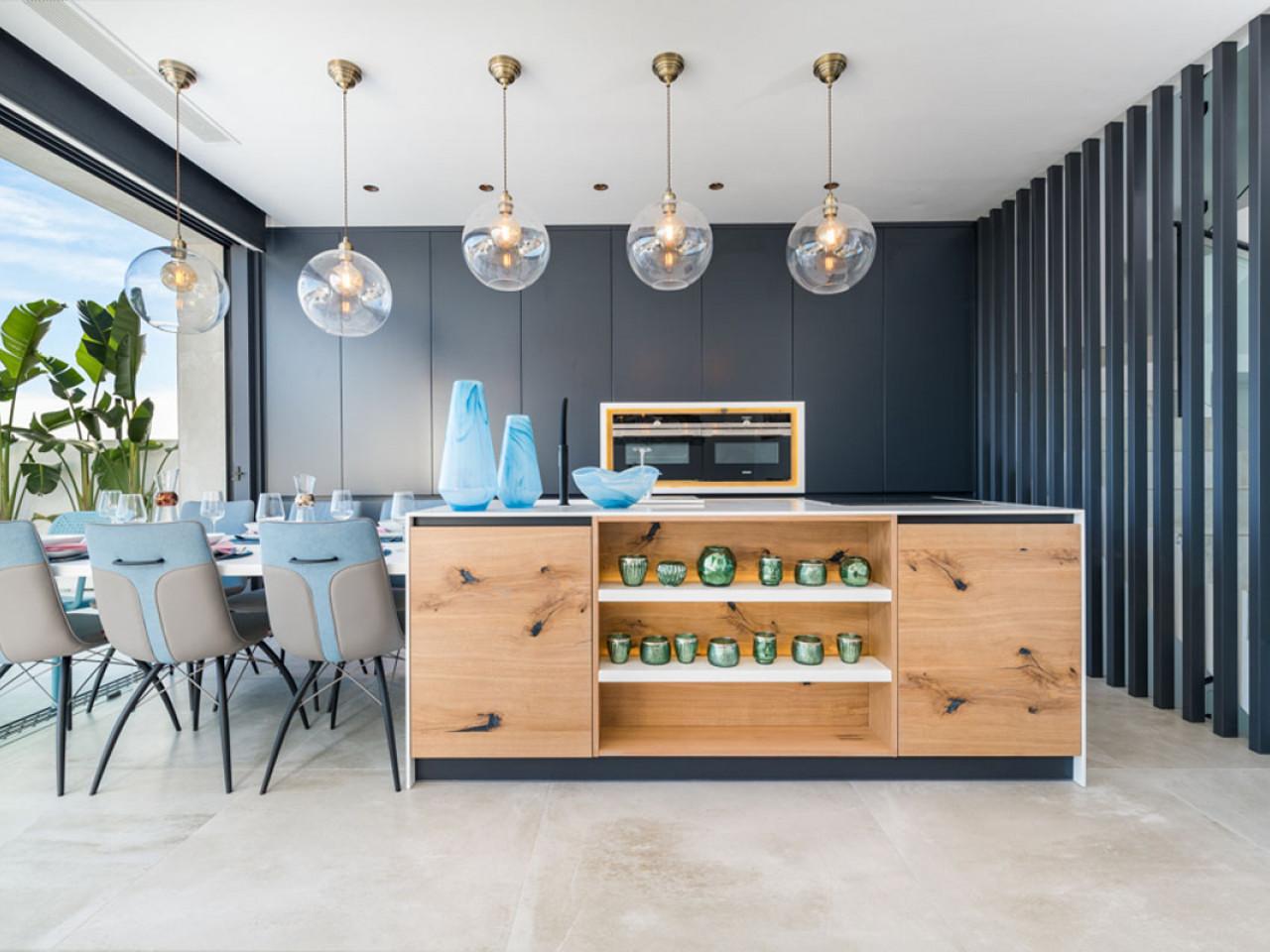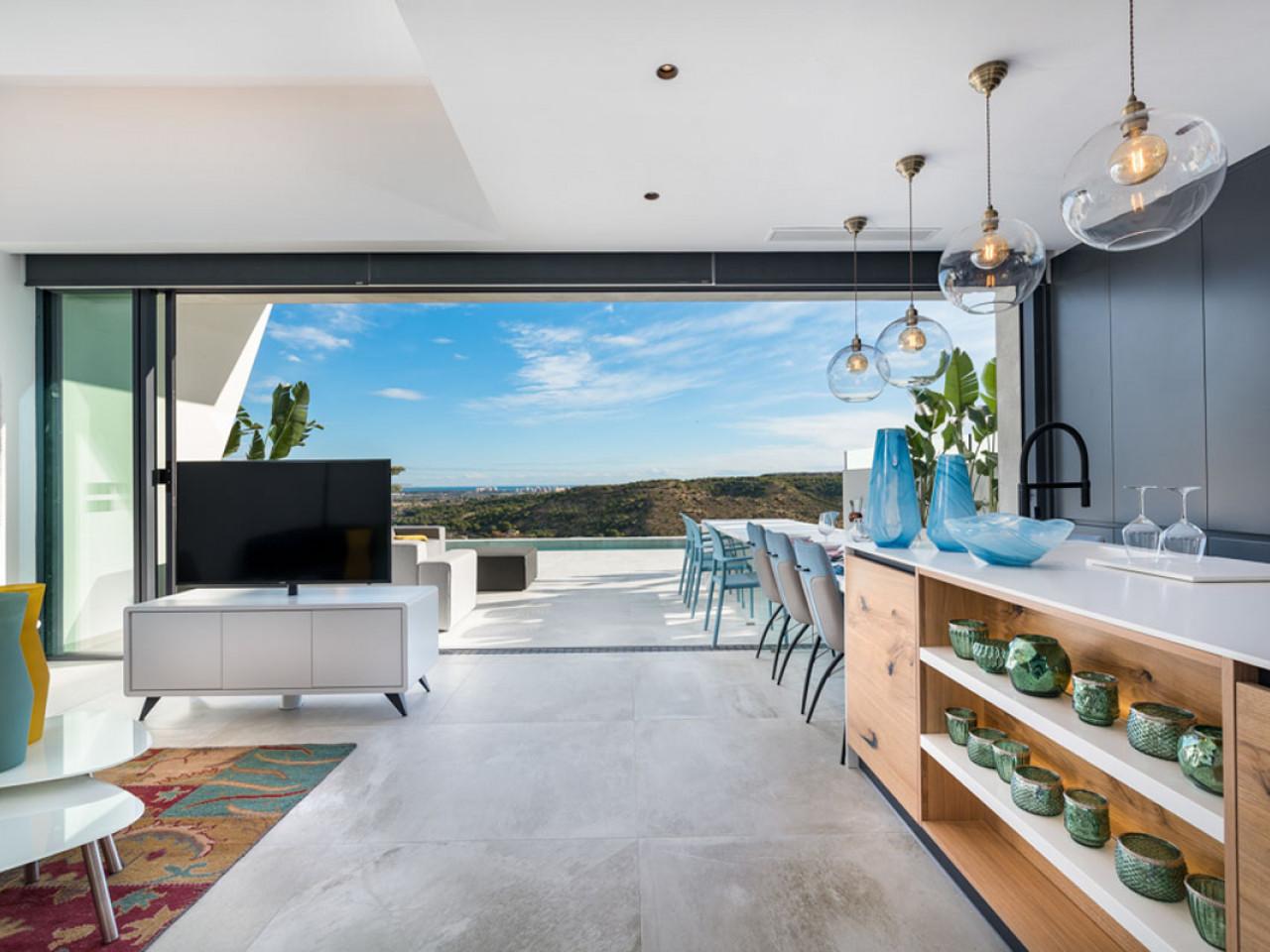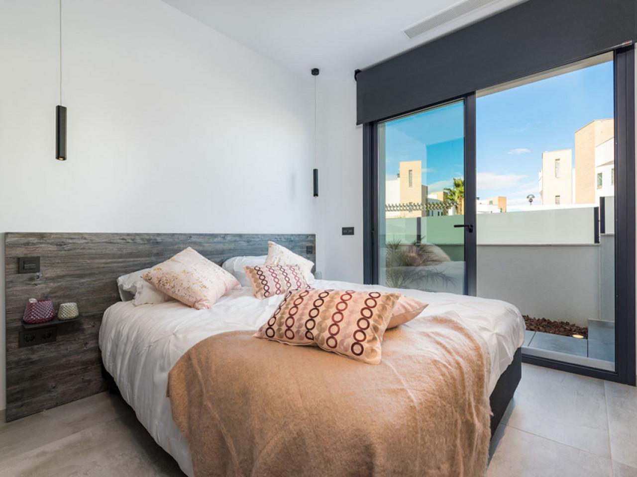 Die Villen verfügen über drei Doppelschlafzimmer (das Hauptschlafzimmer mit Zugang zu einer privaten Terrasse in der zweistöckigen Villa, alle mit Einbauschränken), drei Badezimmer (alle en-suite), eine separate Toilette, eine moderne, voll ausgestattete integrierte Küche und ein geräumiges, offenes Wohn-/Esszimmer, das über breite Flügeltüren in den landschaftlich gestalteten Garten mit überdachtem Essbereich, einen luxuriösen privaten Infinity-Pool, eine Garage und einen Panoramablick auf Guardamar und das Mittelmeer führt.