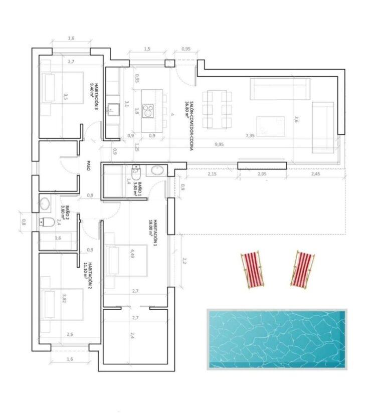 Wohnbereich: Hier finden wir ein geräumiges Wohn-Esszimmer mit offener Küche (Küchenmöbel inklusive), das durch zwei große Fenster mit der großen modernen Veranda verbunden ist, die zum Gartenbereich und zum Pool führt.